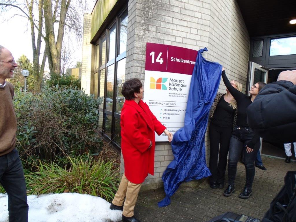 Mit einem kleinen, aber feinen Festakt fand bereits am 14.01.2026 unsere Namensverkündung statt. Frau Dr. Margot Käßmann hat es sich, als Namensgeberin und Patronin der Schule, nicht nehmen lassen, selbst die Enthüllung des neuen Schildes durchzuführen.